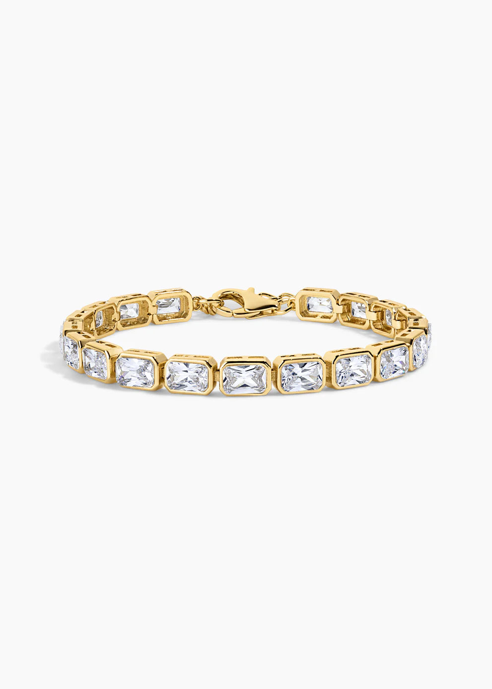 The Prescott Bracelet is a total showstopper. Radiant-cut crystals set in 14kt gold plating make this piece shine bright without trying too hard. It's the kind of bracelet that works whether you're going out or just living your best life.