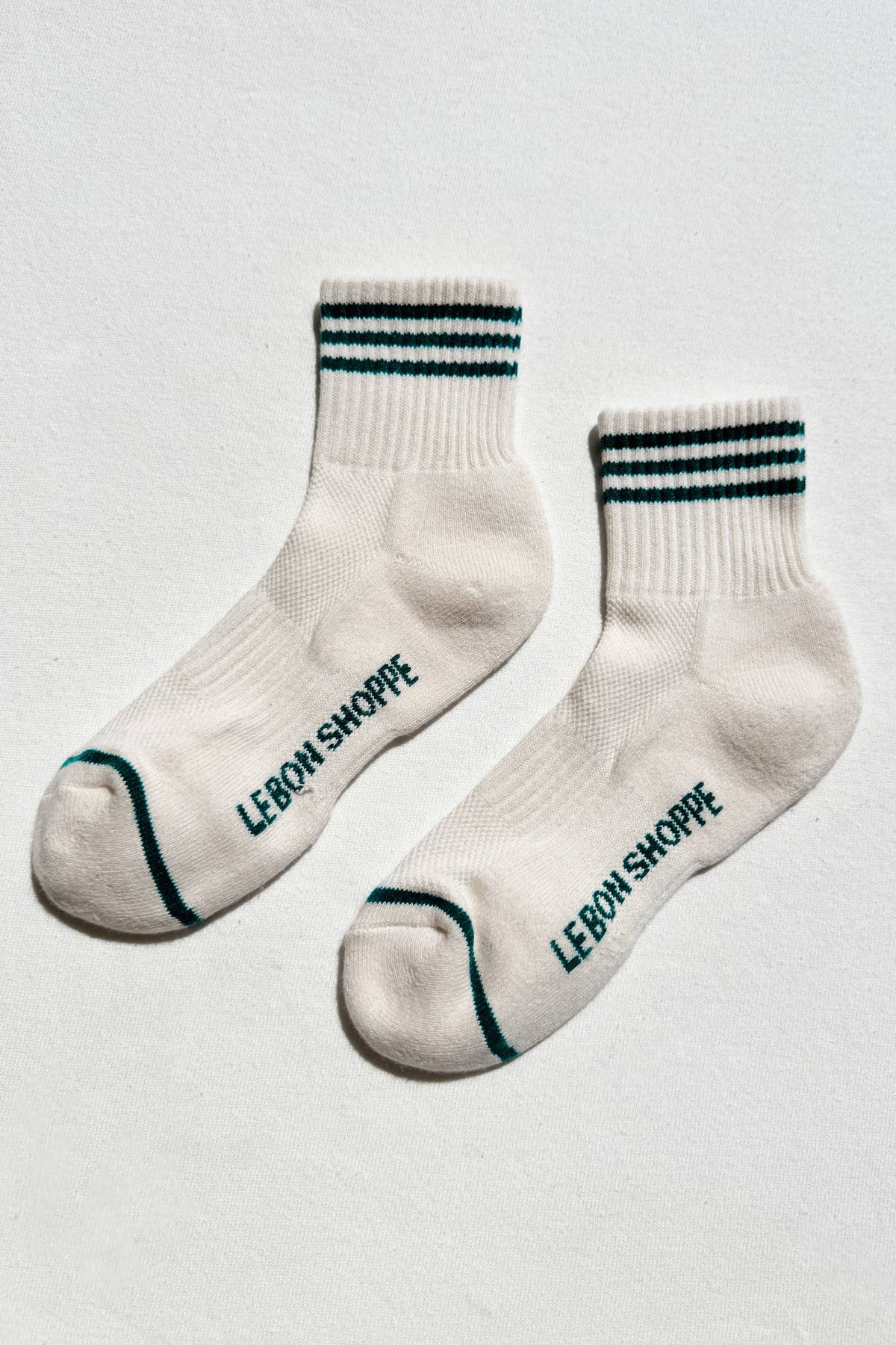 The Girlfriend Socks are like the cooler, more playful cousin of the popular Boyfriend Socks. With an eye-catching triple stripe at the top and a shorter classic crew length, these socks are a must-have in any sock collection.