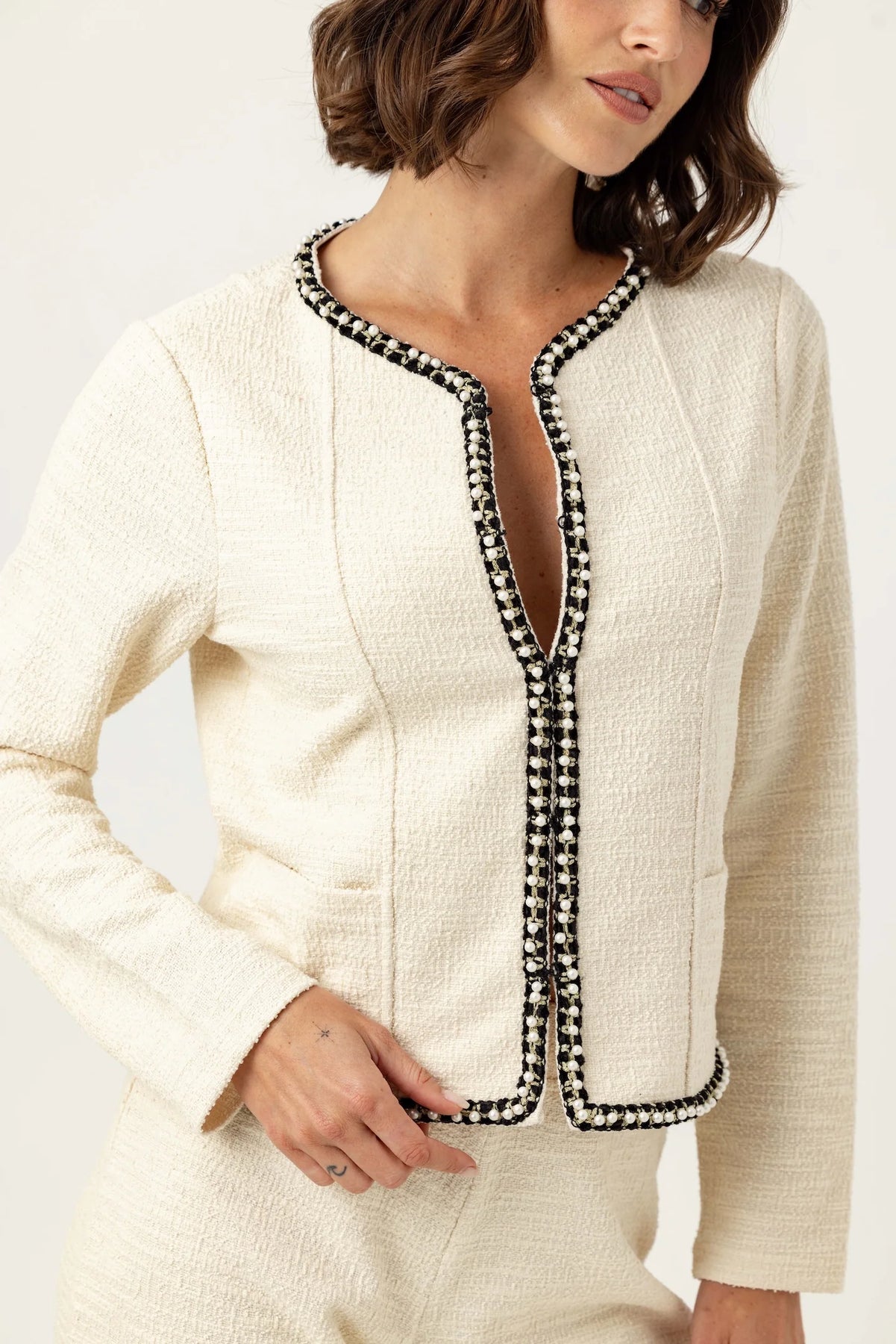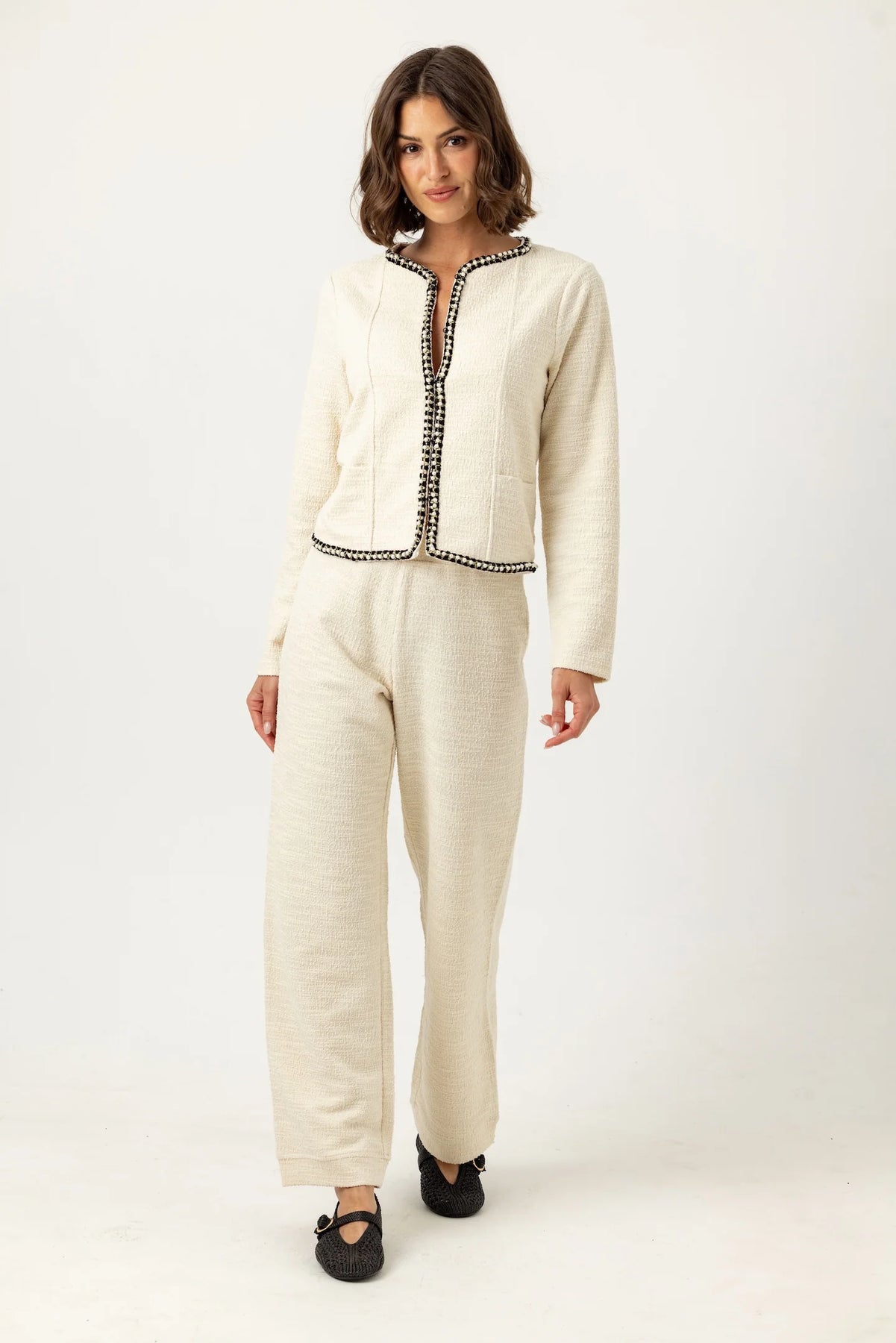 Crafted from Sundays' signature Knit Bouclé with delicate pearl ribbon detailing, the Adeline cardigan delivers understated elegance. The classic jacket cut features a relaxed silhouette, paneled seams, and practical patch pockets for everyday sophistication. Fits true to size—consider sizing up if layering over thicker sweaters or knits.