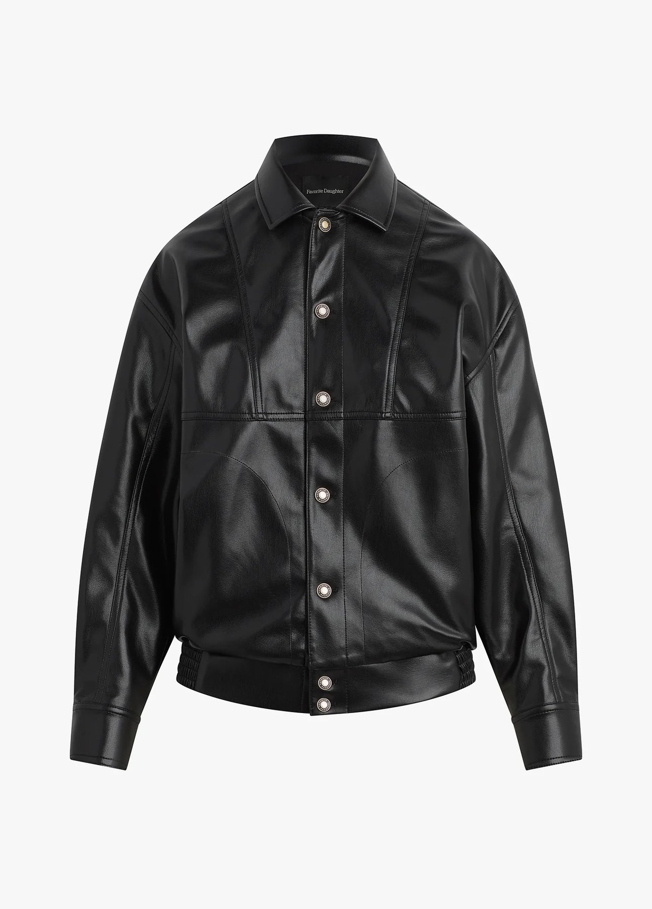 The Favorite Daughter Beacon Jacket features a relaxed, oversized fit with dropped shoulders and a comfortable elastic hem. Crafted from black vegan leather and equipped with handy side pockets, it’s designed to become your go-to outerwear piece.