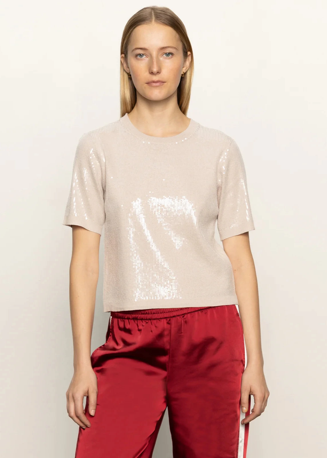 This Sanctuary sweater is made with a crew neck, short sleeves, ribbed cuffs, and an easy pull-on design, all decorated with shimmering sequins for a chic, polished appearance.