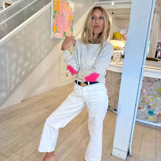 The Kerri Rosenthal Patchwork Pullover in Stardust Heart features elbow patches and a hand-stitched "loved" detail along the hem. Its unique color and subtle accents make it a charming, cozy essential for chilly fall and winter days.