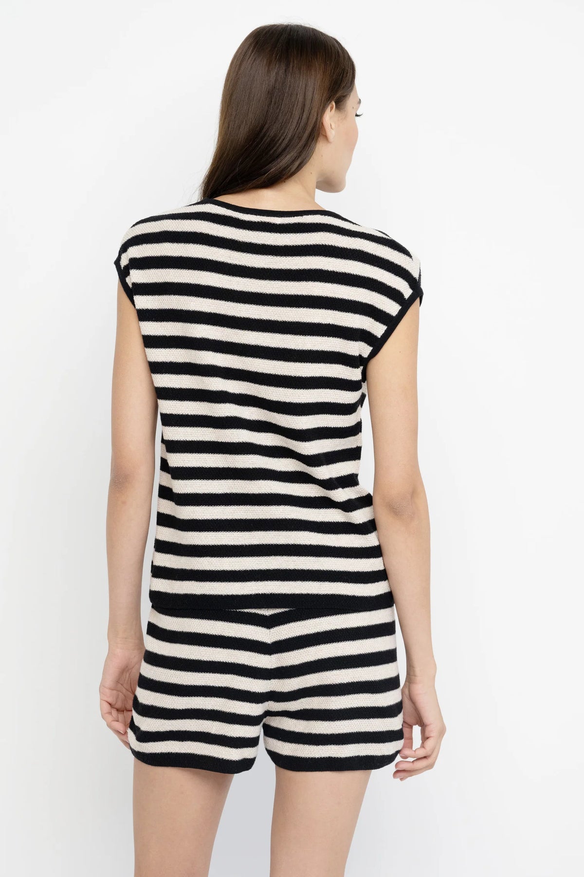 This Lisa Todd Summer Lovin sleeveless knit top has black and tan stripes with a touch of pink embroidery on the hip. Makes the perfect set with the coordinating shorts.