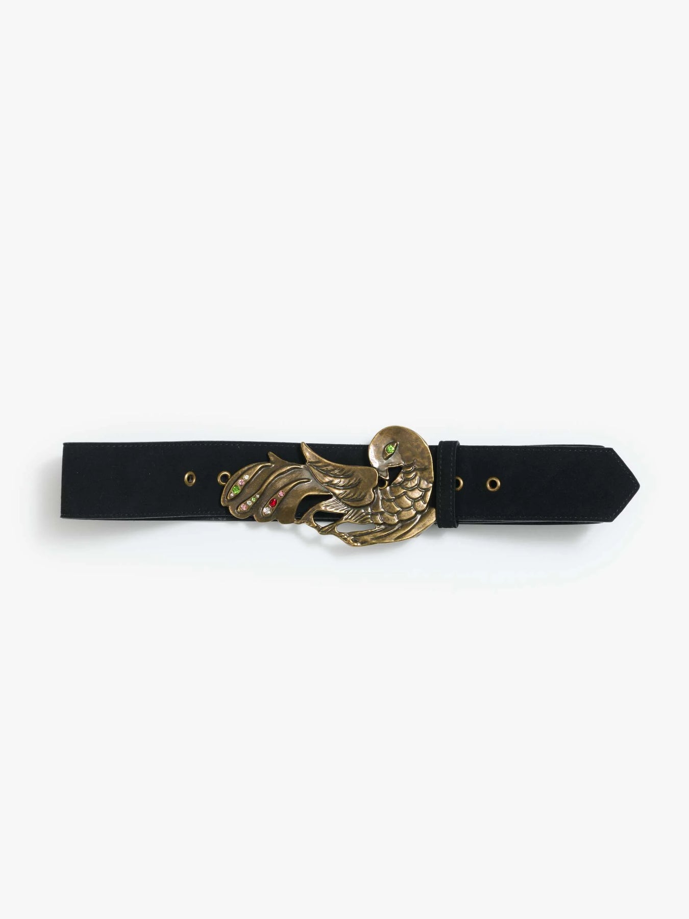 Buckle up. A wide leather belt designed in black suede with an oversized antique brass buckle detailed with colored gemstones.