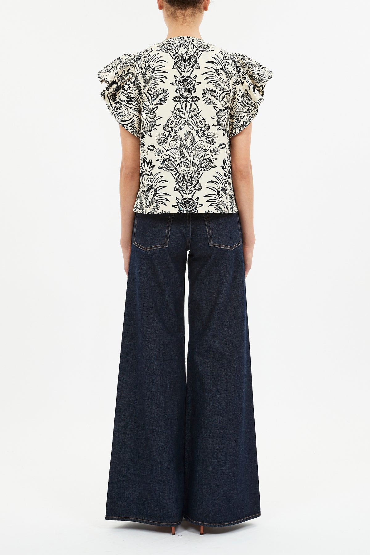 This black and ivory Ulla Johnson Severine Flutter Sleeve Top is made with a symmetrical botanical design including delicate batik-inspired details. The relaxed silhouette and charming flutter sleeves make it effortlessly versatile, pair it with your favorite jeans for a laid-back vibe or dress it up with tailored pieces for a polished look.