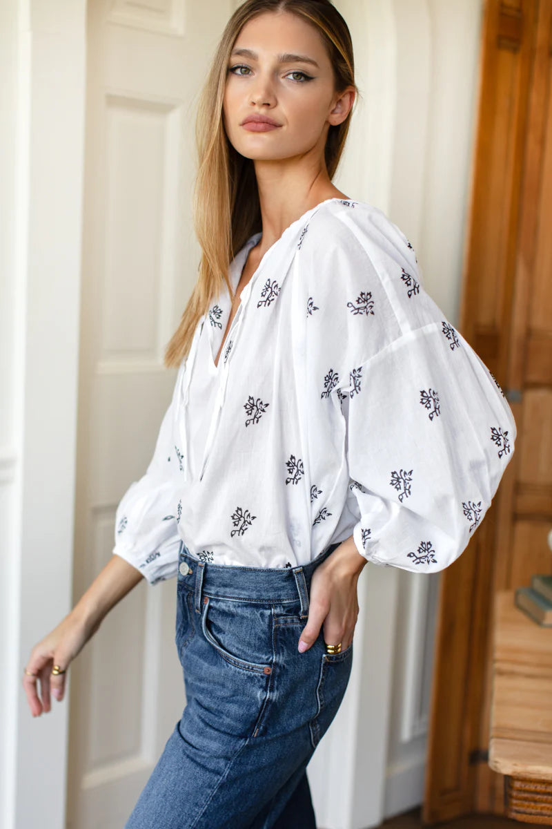 Bring effortless bohemian style to your wardrobe with this Folk Top from Emerson Fry. Created from embroidered cotton, the Emerson Fry Folk Top in Black Sprig showcases a charming split neckline with adjustable ties, comfortable dropped shoulders, and an easy, flowing silhouette that moves with you throughout your day.