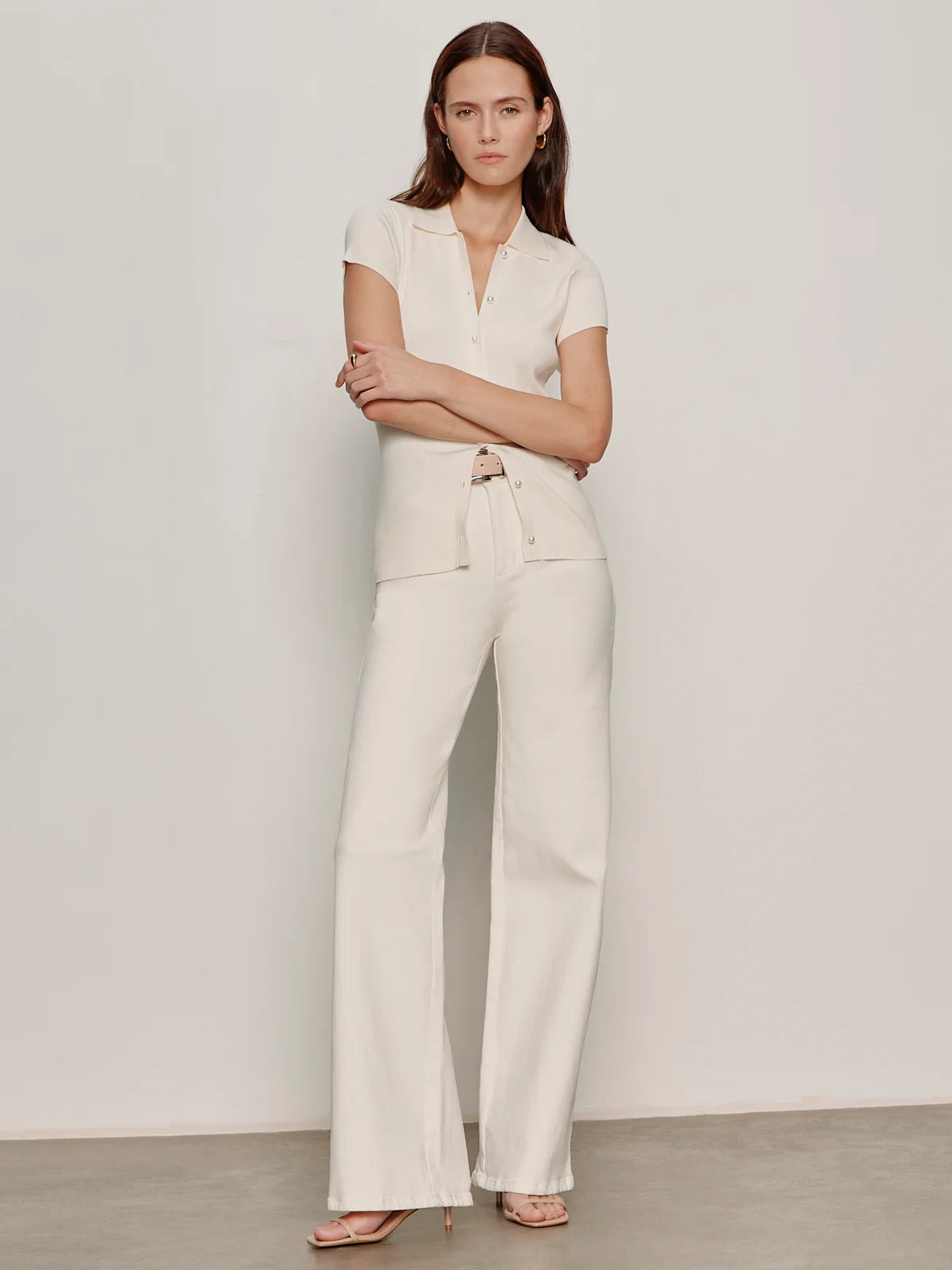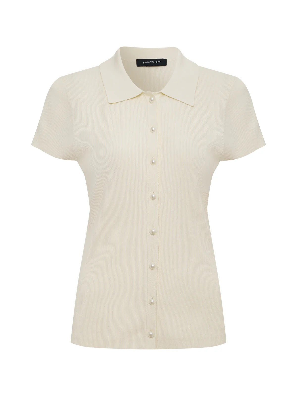 Effortless sophistication in a lightweight ribbed top designed for everyday versatility. This cap sleeve style features a spread collar and button front closure, creating a polished look that works solo or layered. The fitted silhouette flatters while maintaining comfort, making it an ideal transitional piece for any season. Crafted in a soft collagen tone, this wardrobe staple pairs effortlessly with everything from denim to tailored trousers. A modern essential that bridges casual and refined style.